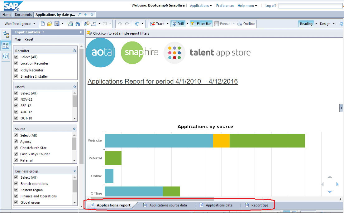 After you have run a report using your organization's data, you can save any changes you have made. For example, you can save the report so that your input control changes are already made (which means next time you run it everything is as you'd like it). Please note that most reports are made up of more than one tab of information - these tabs are called "report tabs" and are located at the bottom of the report data: