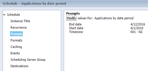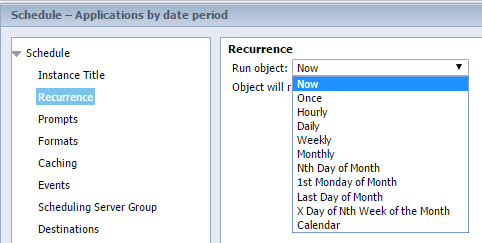 Recurrence - Specify when/how often this report should run. Depending on your selection, further information may need to be entered. Please note that our BusinessObjects server is hosted in New Zealand. We recommend scheduling reports no earlier than 2am (NZ time), and to stagger scheduling instances. Note that data is current to the end of business the day prior.
