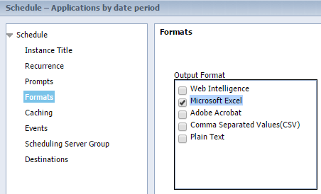 Formats – Select the file format of the report, we typically recommend Microsoft Excel. However, if you wish the report to run within the Business Objects interface (for purposes of dynamic interrogation, rather than dissemination of a static spreadsheet), select the first option: Web Intelligence.